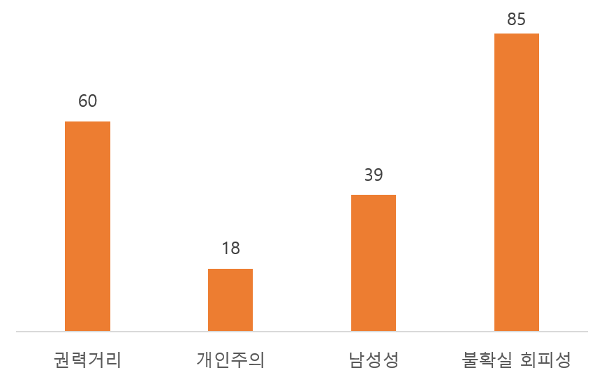 기어트 홉스테드가 이야기하는 한국의 수치는 어떨까? 문화척도론 홈페이지에 들어가보면 나라들에 대한 수치를 알 수 있다. 여기서 South Korea를 확인해보면 다음과 같이 나온다
