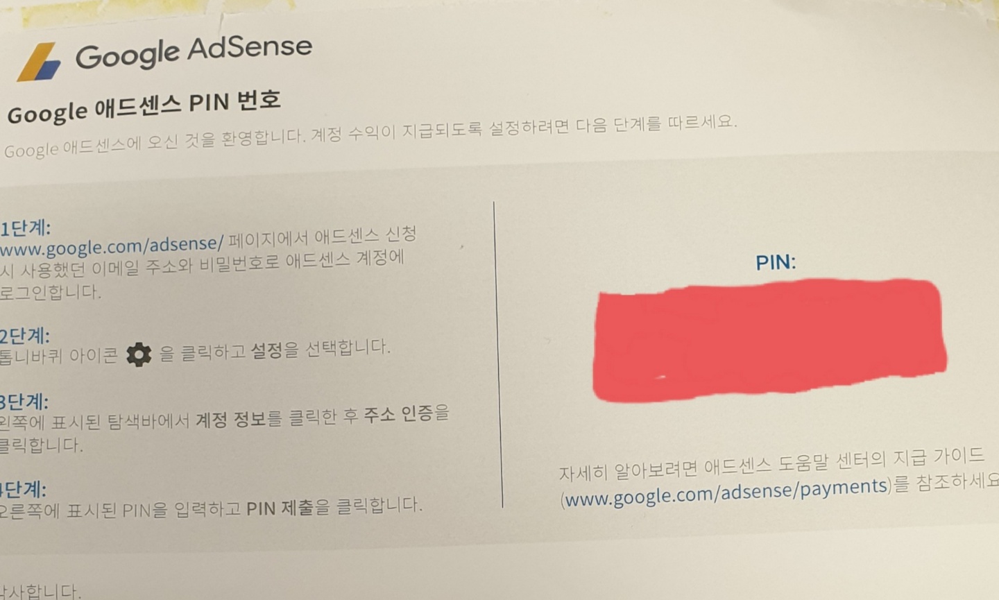 너무 열이 받은 나머지 화난 상태로 인터넷의 애드센스 고객센터에 방문했다. 사정을 설명하고 포스팅 했다. 고객센터는 누구나 다 볼 수 있는 공간이고, 누구나 글을 쓸 수 있는 공간이다. 그러니 천사가 한명 나타났다. 구글이랑 직접 연결하는 일반인인 것 같은 사람이 내 글에 댓글을 적었다. 그리고 사정을 전달해주어, 내 광고가 다시 열리기 시작하고, 약 2주 후 떡하니 주소가 와있는게 아닌가. 그래서 기쁜 마음으로 바로 핀 코드를 입력해버렸다.