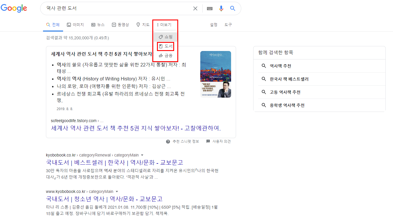검색을 해보면 검색 관련해서 사이트와 내용이 쭉 나오는데, 도서 탭이 없는 걸 알 수 있다. 여기서 "더보기"를 클릭해보면 아래의 그림처럼 나온다