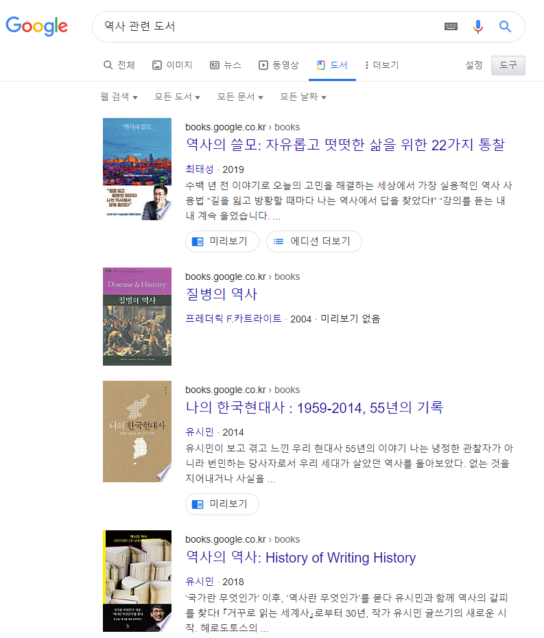 더보기 란에서 도서를 클릭해보면 아래의 그림처럼 나오는데, 저기에서 미리보기를 클릭하면 된다. 아래 나온 책 중에서 가장 위에 있는 역사의 쓸모 최태성 선생님이 쓴 책을 클릭해보겠다.