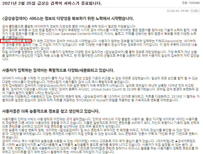 네이버는 지난 2021년 2월 10일쯤 네이버 검색에서 급상승 검색어 서비스(이하 실검-실시간검색)를 2월 25일에 종료한다고 발표했다. 실제로도 25일 날 종료가 되었다. 습관처럼 네이버 포털 사이트에 들어가고, 실시간 검색 버튼을 눌러왔는데, 25일 이후부터 나의 마우스는 포털 안에서 길을 잃고 만 것이다. 실검을 종료한 이유가 있다. 아래 이미지를 보면 빨간색 테두리를 친 것처럼, 애초에 탄생 배경이 정보의 다양성을 확보하기 위함이었다. 그런데 불과 몇 달 전을 생각해봐라. 검색어의 조작은 물론이거니와 선한 영향력이었든, 악한 영향력이었든 언론사는 실시간 검색어로 정보의 다양성을 주지 않았다. 좀 더 명확하게 이야기하면 모든 "것"을 자신들의 트래픽을 위한 수단으로 삼고 있었다.