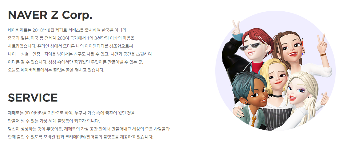 로블록스가 미국 초등학생을 잡았더라면 한국형 메타버스 제페토는 전 세계인을 잡으려 한다. 제페토는 2018년 8월 30일 네이버의 자회사 SNOW에서 출시한 캐릭터 제작 애플리케이션이다. 본인의 사진을 촬영하면 가상 캐릭터인 제페토를 생성해주고, 외형을 커스터마이징하여 꾸밀 수 있다. 이렇게 생성된 캐릭터는 지도를 돌아다니며 이용자 간의 의사소통을 하고, 게임도 하고, SNS 피드도 촬영이 가능하다. 실제로 현실과 똑같은 행위를 가상 현실에서도 할 수 있는 것이다.