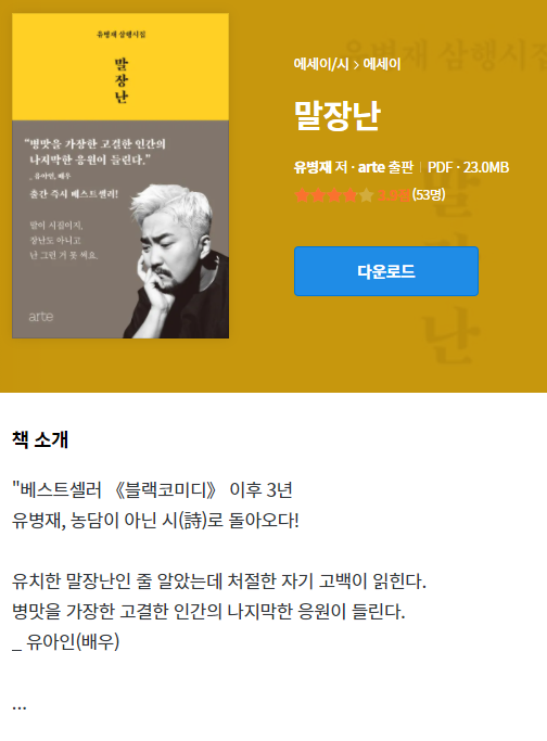 책 제목이 말장난이다. 말장난의 대표적인 놀이인 N 행시로 책이 구성되어 있다. 독자 리뷰를 보면 "돈이 아깝다, 연예인은 쉽게 돈 번다." 등의 악플이 많이 달려 있다. 심지어 별점도 1점대로 구성되어 있다. 뭐, 사람마다 추구하는 가치가 다를 수도 있고, 연예인에 관해 악감정이 있어 일부로 나쁘게 말할 수도 있다. 그리고 진짜로 책 내용이 별로라서 낮은 점수를 줬을 수도 있다.
