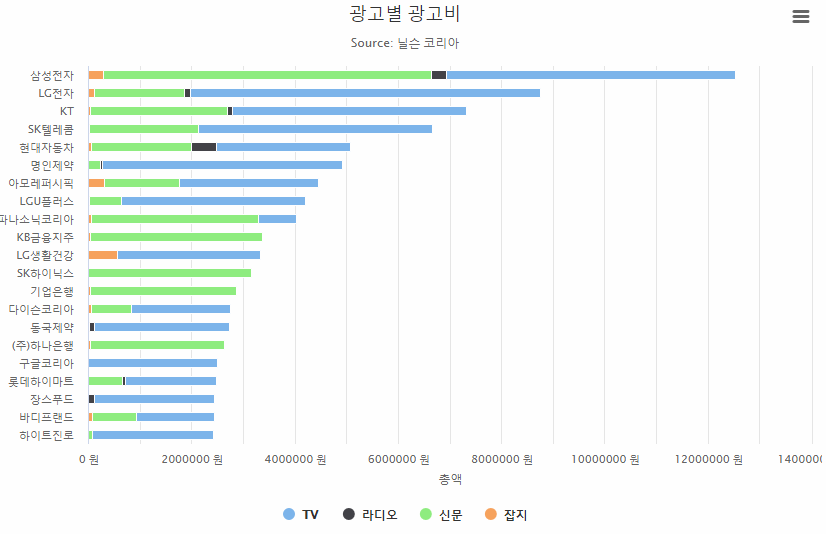실제로 닐슨 코리아가 발표한 국내 광고주 별 광고비 금액을 살펴보자. 삼성이 4대 매체에 라이브 한 광고비는 약 120억이고, LG는 약 80억이다. 국내에서 삼성과 LG가 광고에 많은 돈을 쓴 기업 1위와 2위가 된다.